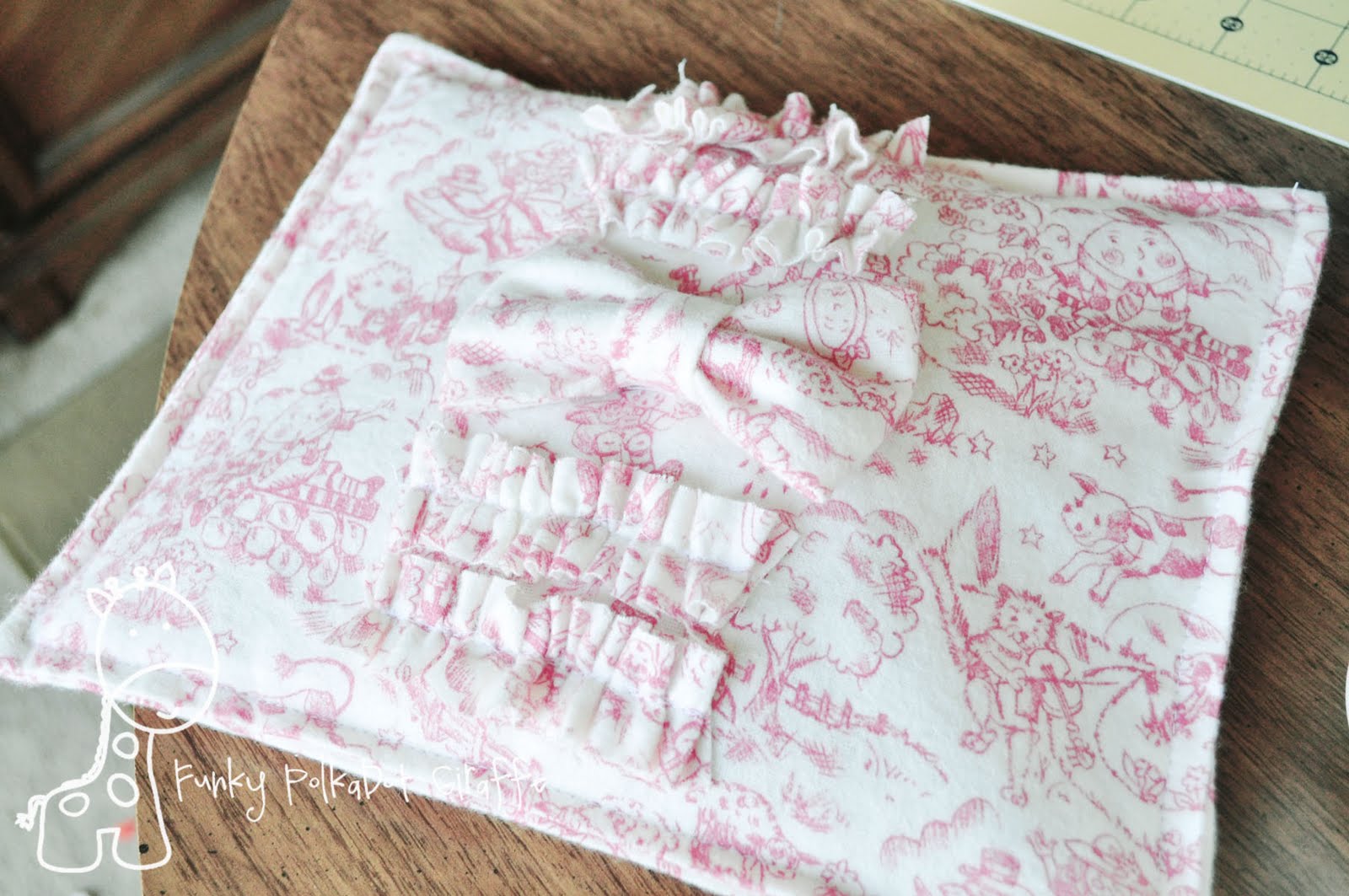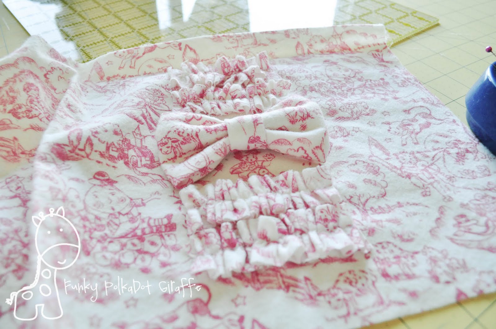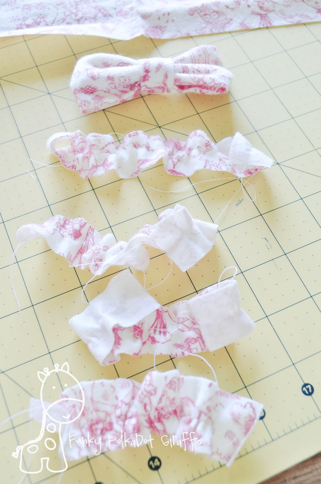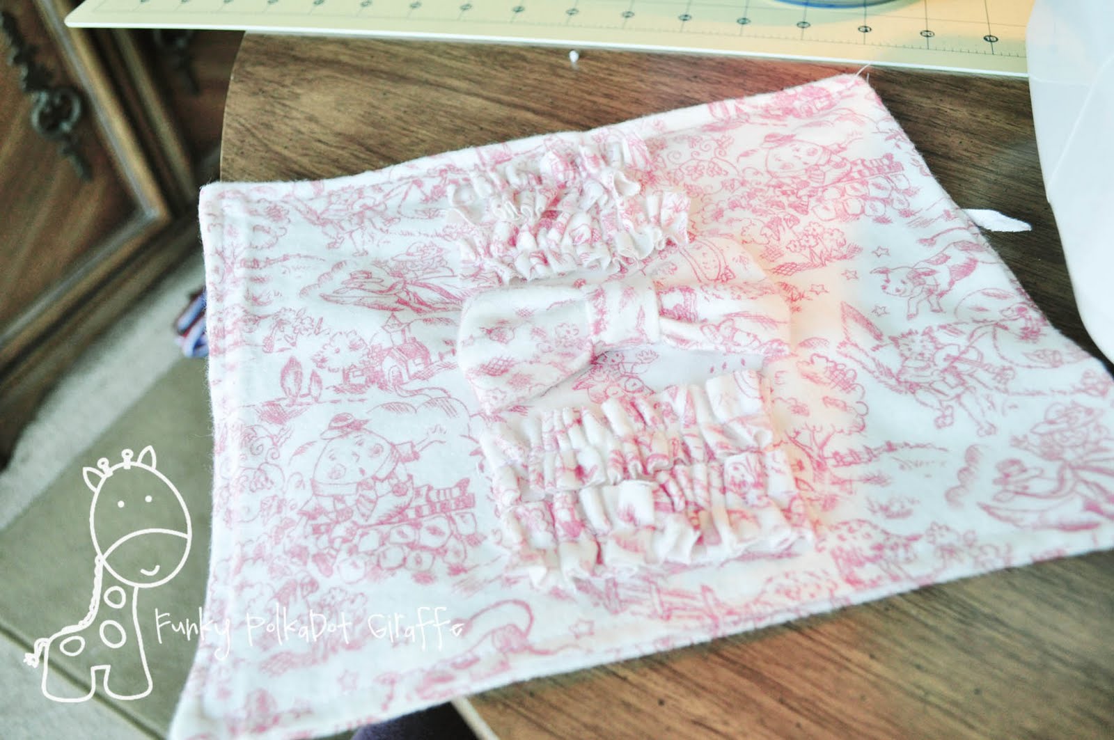 With whatever ruffle method you prefer – be it sewing a long basting stitch and pulling just the top thread to gather, or cheating and letting your machine do the work – ruffle/gather your four pieces of 1×5″ flannel.