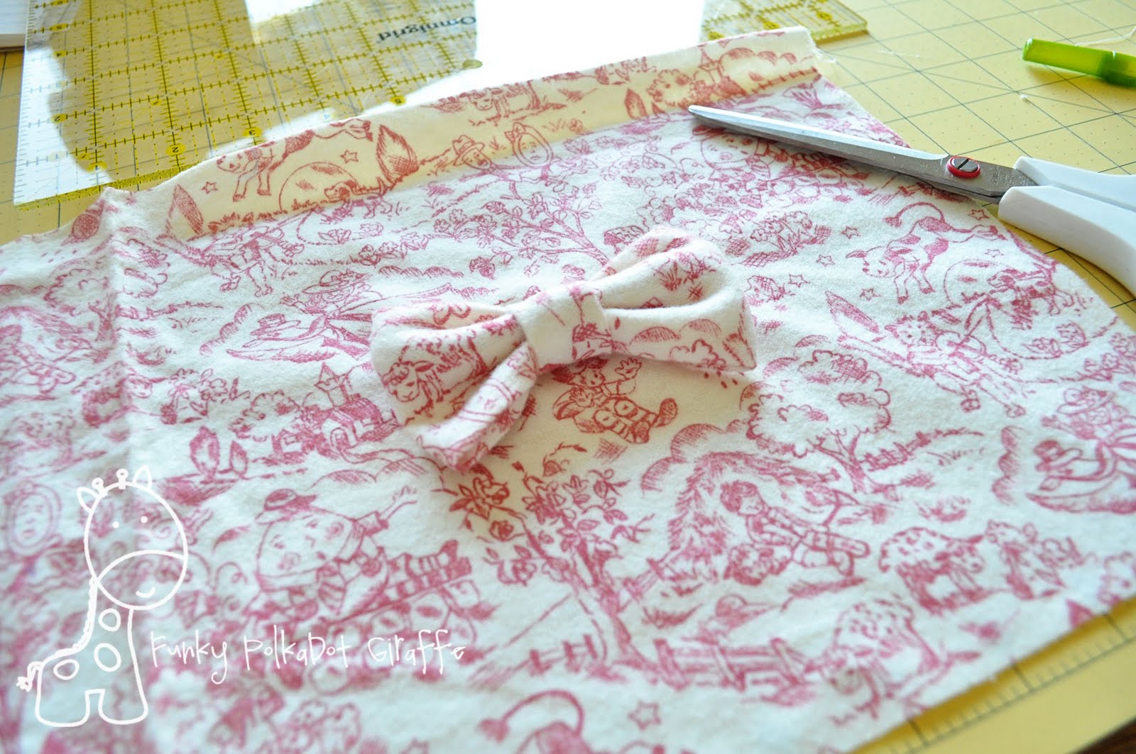 - To make the bow fold the 8×5″, fold the raw edges over to meet in the middle, and sew down the middle.